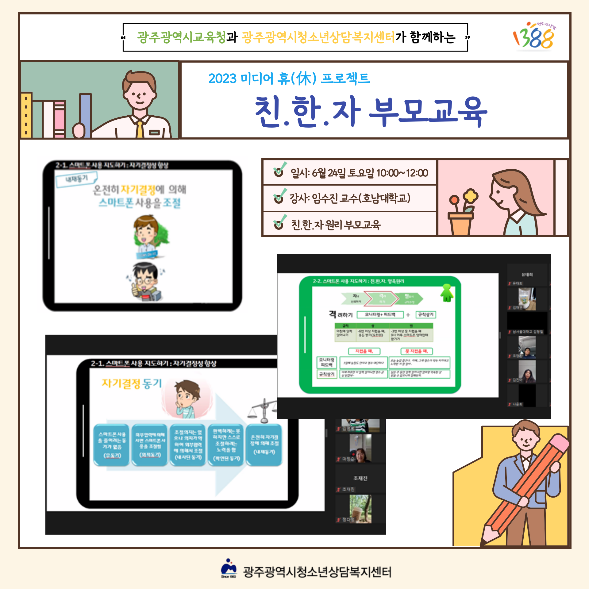 [¹Ìµð¾î °úÀÇÁ¸ ¿¹¹æ ºÎ¸ð±³À°(»ó¹Ý±â)] 6¿ù 24ÀÏ Åä¿äÀÏ 10:00±¤ÁÖ±¤¿ª½Ã±³À°Ã»°ú ±¤ÁÖ±¤¿ª½Ãû¼Ò³â»ó´ãº¹Áö¼¾ÅͰ¡ ÇÔ²²ÇÏ´Â ¹Ìµð¾î °úÀÇÁ¸ ¿¹¹æ ºÎ¸ð±³À°(Áßµî)ÀÌ ÁøÇàµÇ¾ú½À´Ï´Ù.Ȳ±Ý°°Àº Åä¿äÀÏ ¾ÆÄ§ÀÓ¿¡µµ ºÒ±¸ÇÏ°í ¿ì¸® ÀÚ³àÀÇ ¹Ìµð¾î »ç¿ë ½À°ü¿¡ ´ëÇØ ÀÌÇØÇϰí,ºÎ¸ð·Î½á ¿Ã¹Ù¸£°Ô ±³À°ÇϰíÀÚ ÇÏ´Â ºÎ¸ð´ÔµéÀÌ ¿Á¤ÀûÀ¸·Î Âü¿©ÇØÁּ̽À´Ï´Ù~!¿À´Ã ±³À°À» ÅëÇØ Ä£/ÇÑ/ÀÚÀÇ ¿ø¸®¸¦ ÇÔ²² ¹è¿öº¸°í ÀÌÇØÇØº¼ ¼ö ÀÖ´Â ½Ã°£À̾ú´Âµ¥¿ä!Áö±Ýµµ ÃæºÐÈ÷ ÀßÇÏ°í °è½ÃÁö¸¸ ´õ ³ªÀº ºÎ¸ð°¡ µÇ±âÀ§ÇØ ³ë·ÂÇϽô ¸ð½ÀÀÌ ¾Æ¸§´ä½À´Ï´Ù! ±³À°À» ÅëÇØ ¹è¿î ³»¿ëÀ» °¡Á¤¿¡¼ Àû¿ëÇØº¸¸é¼ ÀÌÀüº¸´Ù ´õ ³ªÀº ºÎ¸ð ¿ªÇÒÀ» ÇØ³»´Â ºÎ¸ð´ÔµéÀÌ µÇ½Ã±æ ÀÀ¿øÇϰڽÀ´Ï´Ù "²Þ²Ù´Â û¼Ò³â, ¿òÁ÷ÀÌ´Â Áö¿ª»çȸ, ÇÔ²²ÇÏ´Â ¿ì¸®"