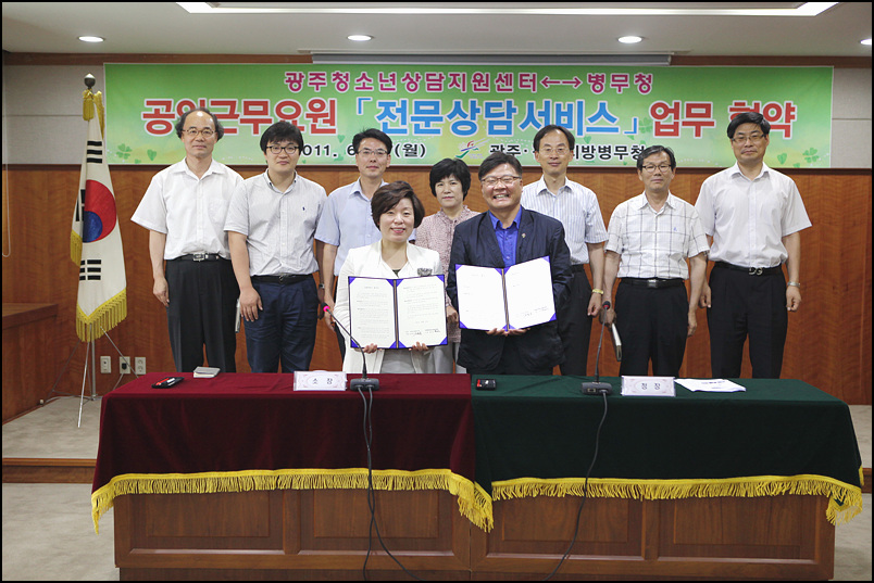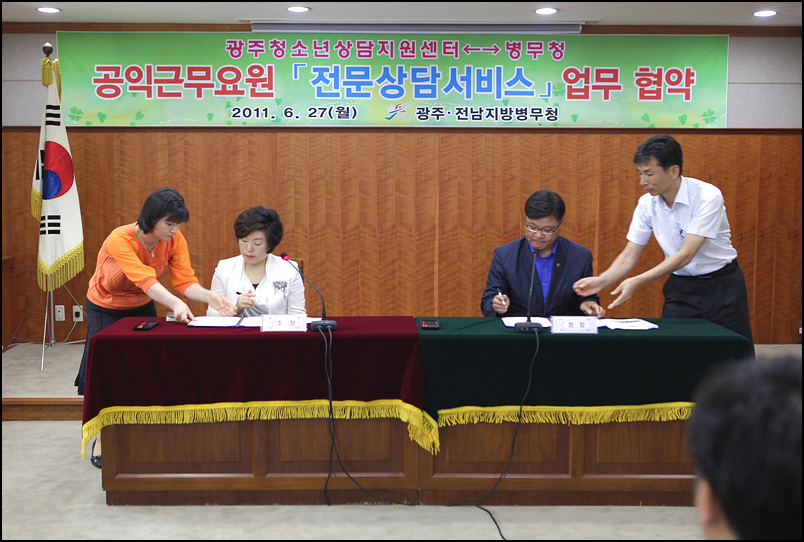 2011³â 6¿ù 27ÀÏ(¿ù) 11½Ã¿¡ ±¤ÁÖ¤ýÀü³²Áö¹æº´¹«Ã»¿¡¼ °øÀͱٹ«¿ä¿ø Àü¹®»ó´ã¼ºñ½º¸¦ À§ÇÑ ¾ç ±â°ü°£ ¾÷¹«Çù¾àÀ» ü°áÇÏ¿´½À´Ï´Ù.