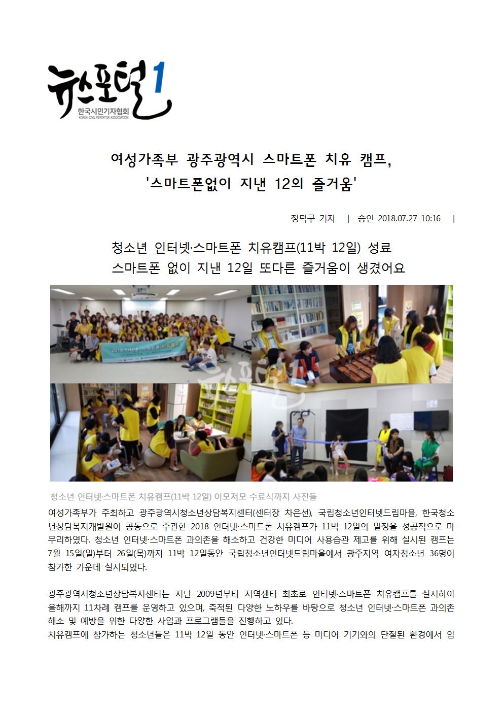 2018.07.27[´º½ºÆ÷ÅÐ1]¿©¼º°¡Á·ºÎ ±¤ÁÖ±¤¿ª½Ã ½º¸¶Æ®Æù Ä¡À¯ Ä·ÇÁ, '½º¸¶Æ®Æù¾øÀÌ Áö³½ 12ÀÇ Áñ°Å¿ò'