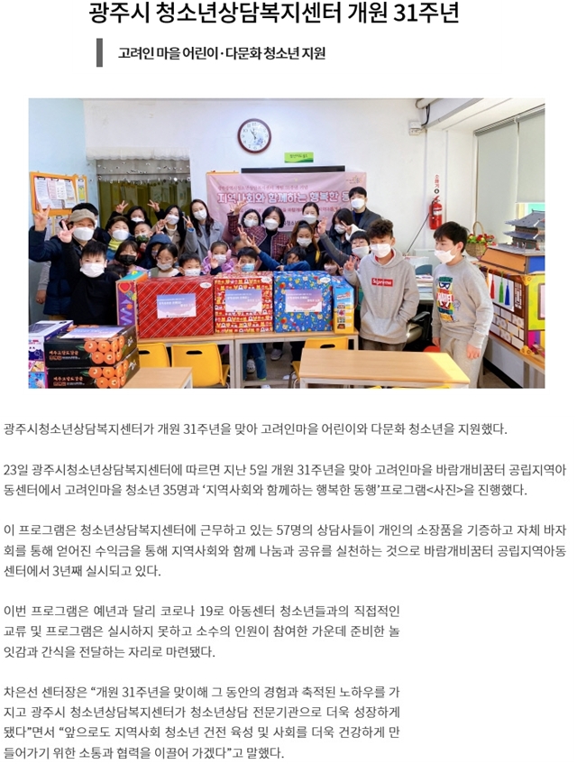 2021.02.23[±¤ÁÖÀϺ¸]±¤Áֽà û¼Ò³â»ó´ãº¹Áö¼¾ÅÍ °³¿ø31ÁÖ³â